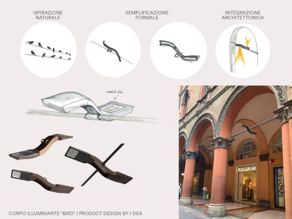 Per i portici è stato progettato ad hoc un nuovo corpo illuminante chiamato Bird composto da due fonti LED caratterizzate da differenti temperature di colore per illuminare contemporaneamente strada e portico, con differenti effetti di luce. In alcuni casi si è invece scelto di preservare l’identità storico-artistica del luogo mediante il mantenimento dei corpi illuminanti esistenti.