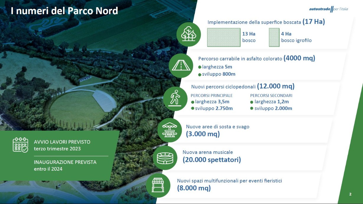 Il progetto per la riqualificazione del parco Nord, rappresenta il primo step di un fitto programma di iniziative in ottica sostenibile del Passante che conta circa 160 ettari di nuove aree verdi, la piantumazione di circa 35 mila alberi, la realizzazione di piste ciclabili per favorire la mobilità sostenibile, e interventi di mitigazione acustica con 20 chilometri di barriere fonoassorbenti di ultima generazione.