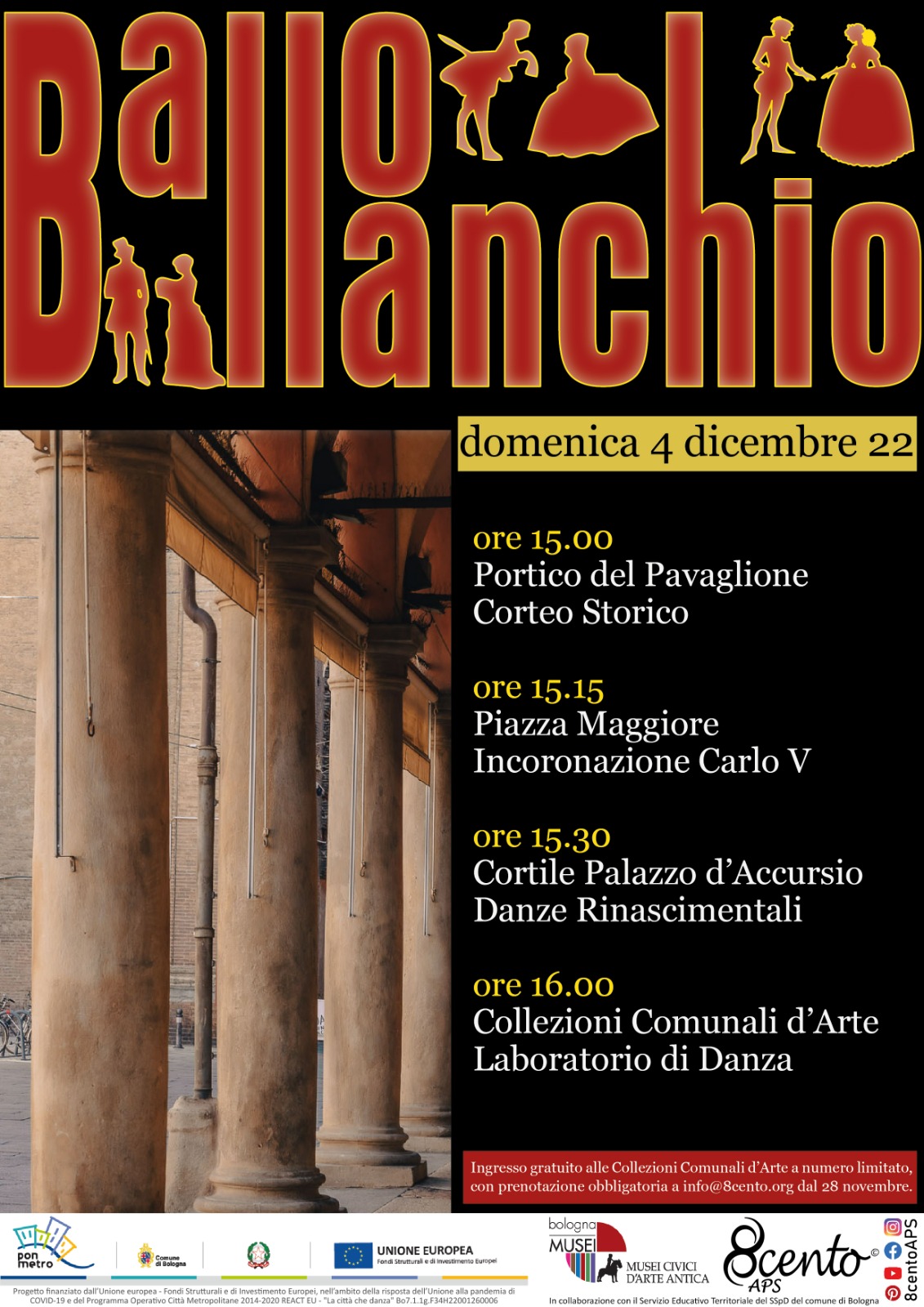 Si tratta del primo momento performativo di Ballo anch'io, il progetto che si propone di far conoscere la storia di Bologna, dei suoi portici e delle sue comunità attraverso la Danza Storica, inserito nel PON Metro REACT “La città che danza” e “La città che risuona” del Comune di Bologna che promuove inclusione sociale attraverso la musica e la danza, con finanziamenti dell’Unione europea nell’ambito del Programma Operativo Città Metropolitane 2014-2020 e della risposta dell’Unione alla pandemia di COVID-19.