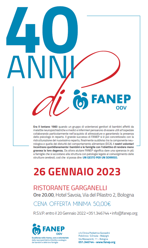 Giovedì 26 gennaio, al Ristorante Garganelli presso l'Hotel Savoia, si festeggeranno i 40 anni della FANEP, nata nel 1983 grazie ad un gruppo di volenterosi genitori di bambini affetti da malattie neuropsichiatriche, insieme a medici e infermieri del reparto di Neurologia Pediatrica dell'Istituto Gozzadini di Bologna, per aiutare l'Ospedale nell'acquisto di attrezzature e garantire la presenza dello psicologo in reparto. Fin dagli esordi, gli impegni di FANEP non riguardano solo la raccolta fondi, il sostegno familiare e la ricerca scientifica, ma anche la prevenzione e la diagnosi precoce nell’ambito dei disturbi alimentari dei minori e delle malattie neuropsichiatriche infantili.