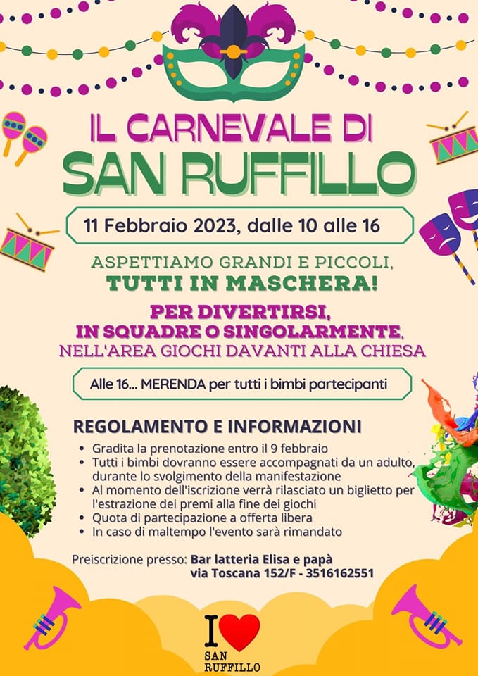 Sabato 11 febbraio, presso l'area giochi davanti alla Chiesa di San Ruffillo in via Toscana 146, dalle 10 alle 16 si festeggierà il carnevale di san Ruffilo, con grande merenda per tutti i partecipanti e estrazione di premi finale.
