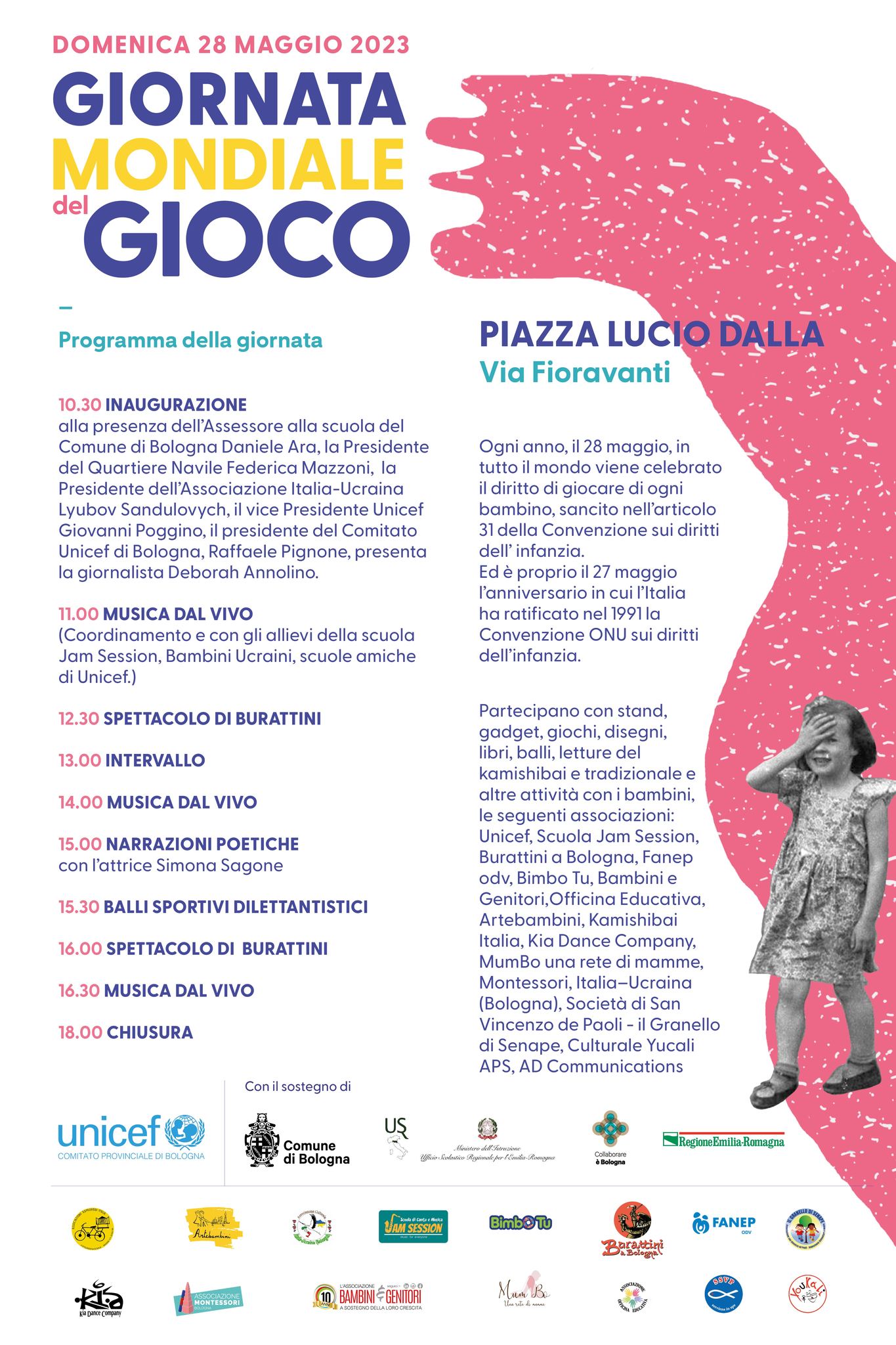 Il 28 maggio in tutta Italia si celebra la Giornata Mondiale del Gioco. Come ogni anno UNICEF Comitato Provinciale di Bologna organizza, in collaborazione con il Comune di Bologna e Cinnica, con il supporto di Estragon Club, un evento per celebrare il diritto di giocare di tutti i bambini.