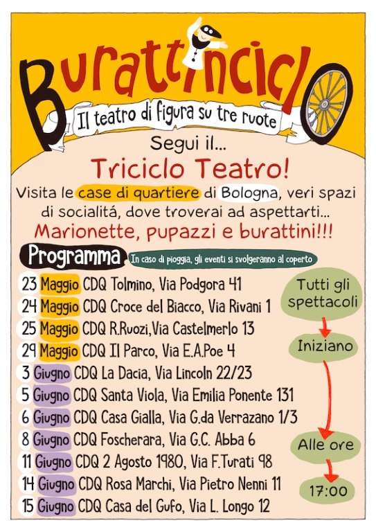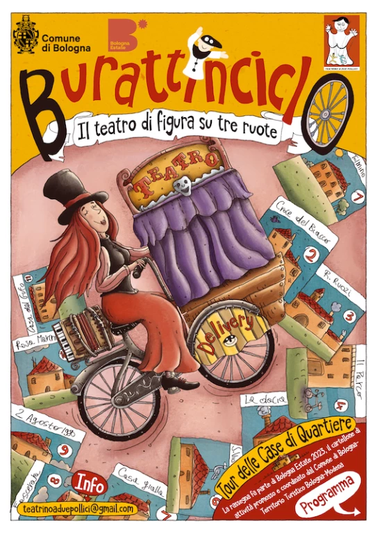 L'Associazione Teatrino a due Pollici ha proposto una rassegna di teatro itinerante che coinvolge dieci Case di Quartiere di Bologna. L'obiettivo principale dell'associazione è promuovere il teatro delle marionette come strumento per creare aggregazione sociale e scambio culturale sul territorio.