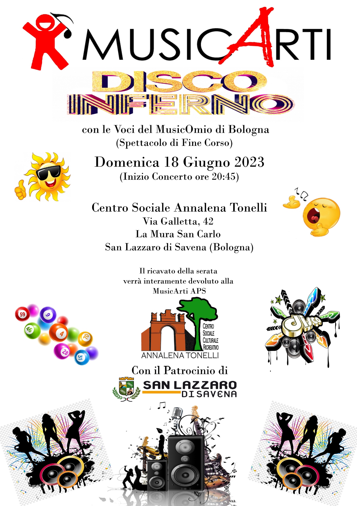 Domenica 18 Giugno 2023 alle ore 20:45, la Sala Polivalente Annalena Tonellia San Carlo, sarà il palcoscenico dello spettacolo “Disco Inferno" delle MusicArti APS.