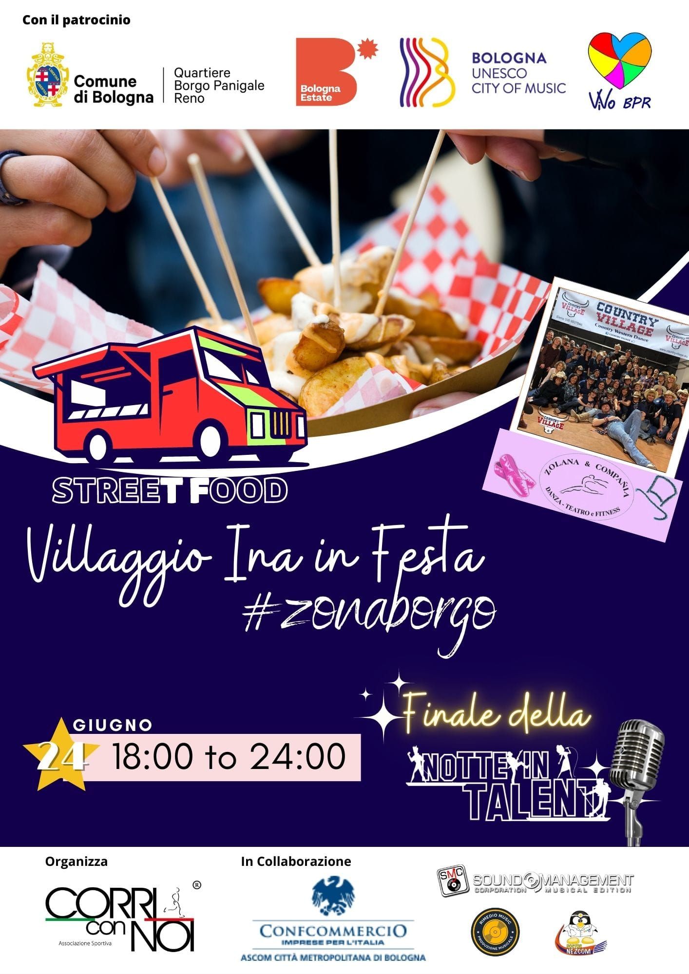 A partire dalle 18 fino alle 24 il quartiere Borgo Panigale-Reno, in particolare via del Carroccio, si riempirà di Street Food, eventi e soprattutto si terrà la Finale della Notte in Talent!