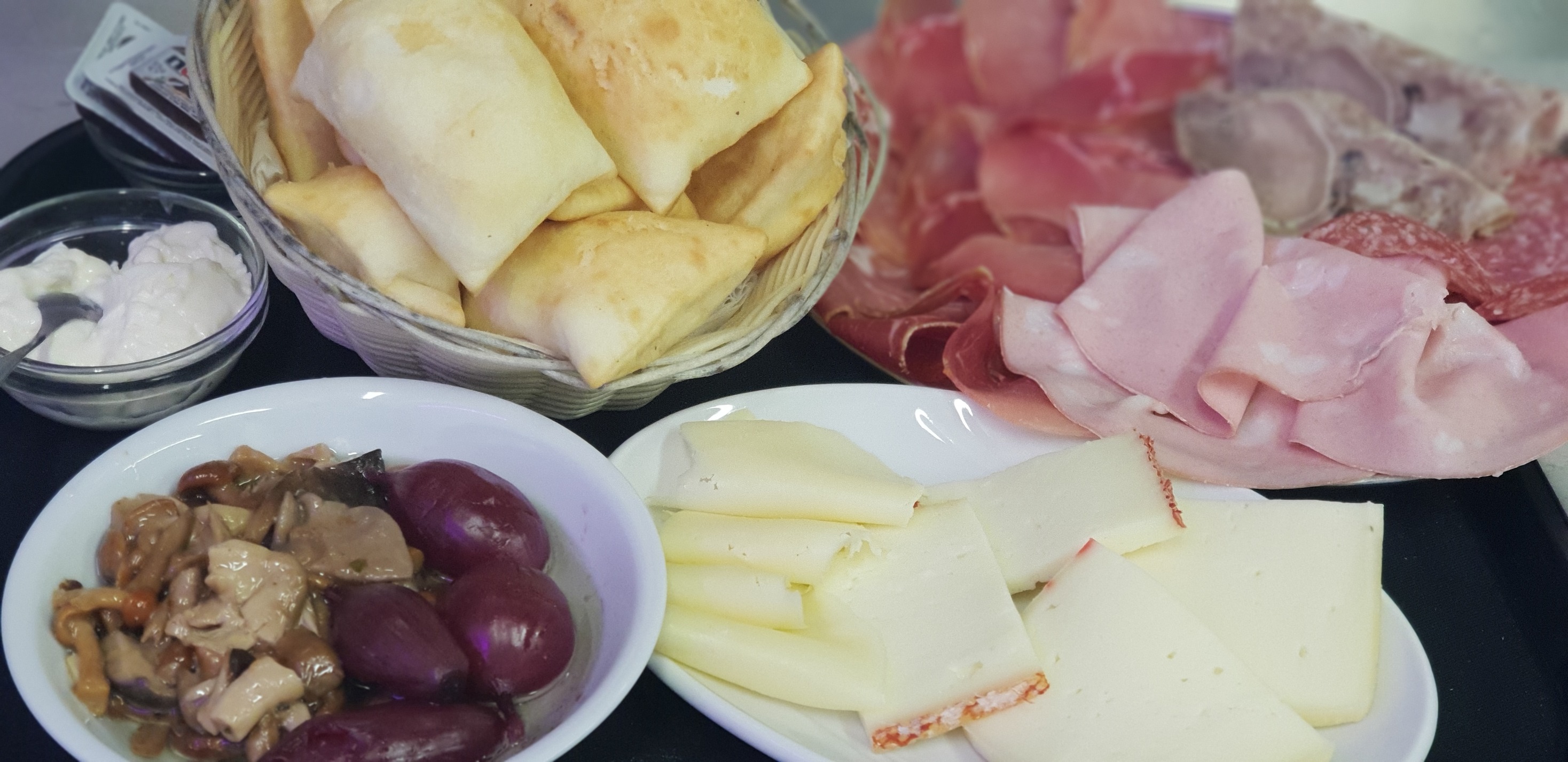 Pasta fatta in casa, grigliate di carne, crescentine con affettati, ma anche rane fritte oltre agli ottimi dolci casalinghi.