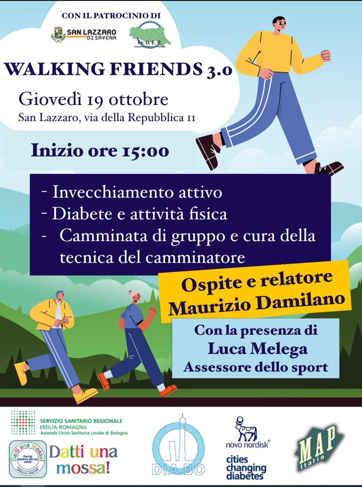 Domani, giovedì 19 ottobre, è prevista una camminata di gruppo - Walking Friends 3.0 - organizzata in collaborazione con l'AUSL per sostenere la prevenzione e cura del diabete di tipo 2. L'evento inizierà alle ore 15.00 presso via Repubblica 11, e terminerà alle ore 17.