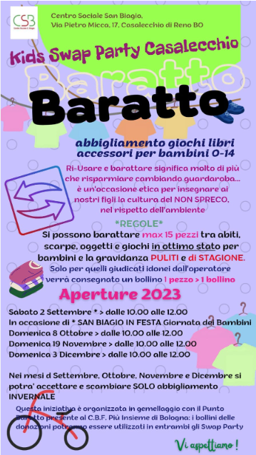 Domenica 19 novembre 2023, presso il Centro Sociale San Biagio, dalle ore 10:00 alle 12:00 si terrà la Festa del Baratto: l'iniziativa dedicata all'abbigliamento, giochi, libri e accessori per bambini nell'età compresa tra 0 e 14 anni.