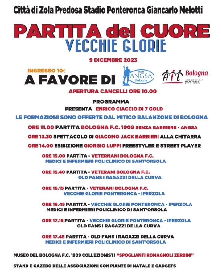 Sabato 9 dicembre si terrà la "Partita del Cuore" presso lo stadio di Ponte Ronca: un'occasione unica per celebrare le Vecchie glorie del Bologna F.C. e promuovere la solidarietà e la beneficenza.