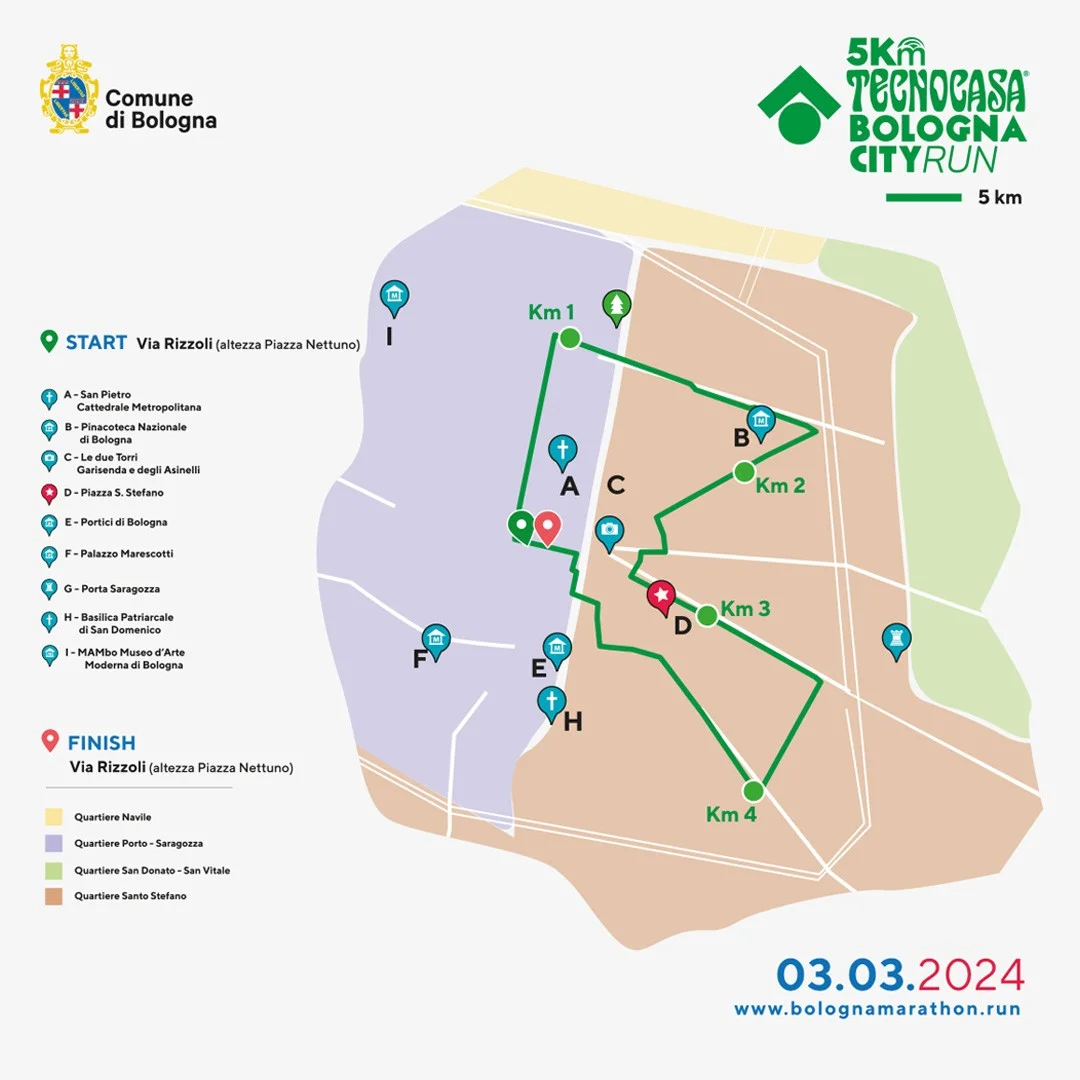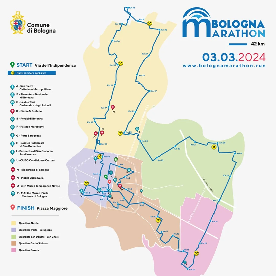 - -Bologna Marathon (42,195 km): partenza da via Indipendenza, uscita dal quartiere Santo Stefano (verso San Giacomo fuori le mura), quartieri Savena e San Donato-Vitale, rientro da Corticella e lungo la Bolognina per arrivare infine in Piazza Maggiore;