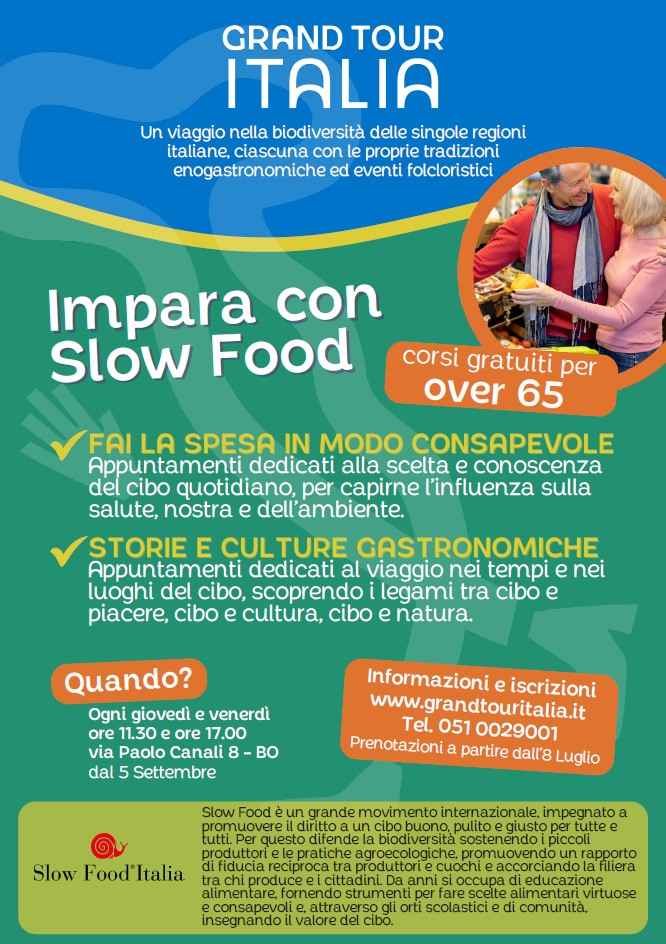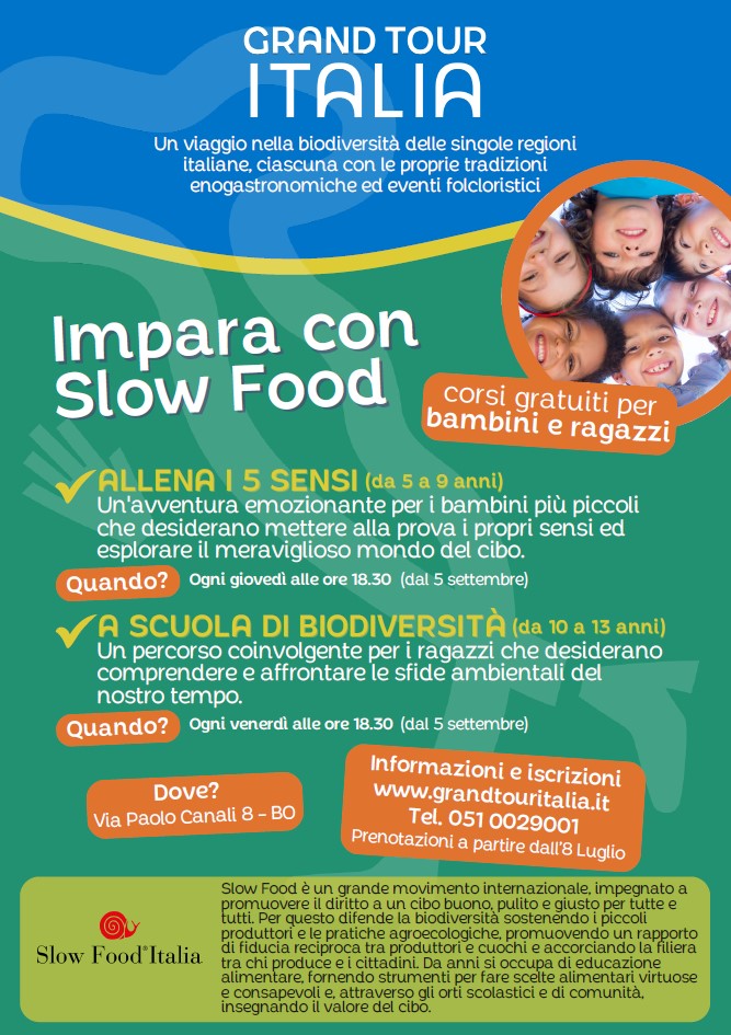 Sul sito internet di Grand Tour Italia è sempre aperta l'iscrizione gratuita ai corsi di enogastronomia, che si svolgeranno dal prossimo 5 settembre, data di apertura del nuovo parco tematico che si propone di divulgare il piacere del cibo legato alle singole peculiatirtà di ogni regione italiana. I corsi saranno tenuti da docenti dell’Associazione Slow Food, completamente gratuiti rivolti agli over 65 e pensionati e ai bambini dai 5 ai 13 anni.