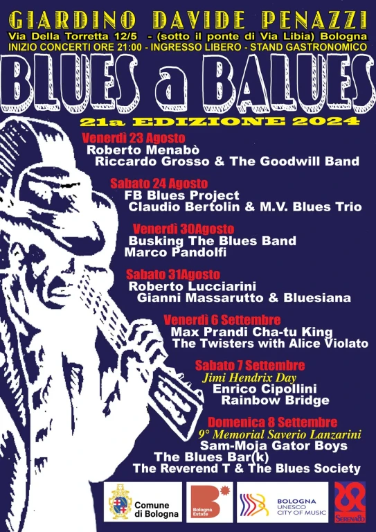Il festival, organizzato dall’associazione Serena 80, di svolge da venerdì 23 agosto a domenica 8 settembre a Bologna nel Giardino Davide Penazzi, con ingresso da via della Torretta 12/5, sotto il ponte di via Libia, e spazierà tra i vari stili del blues.