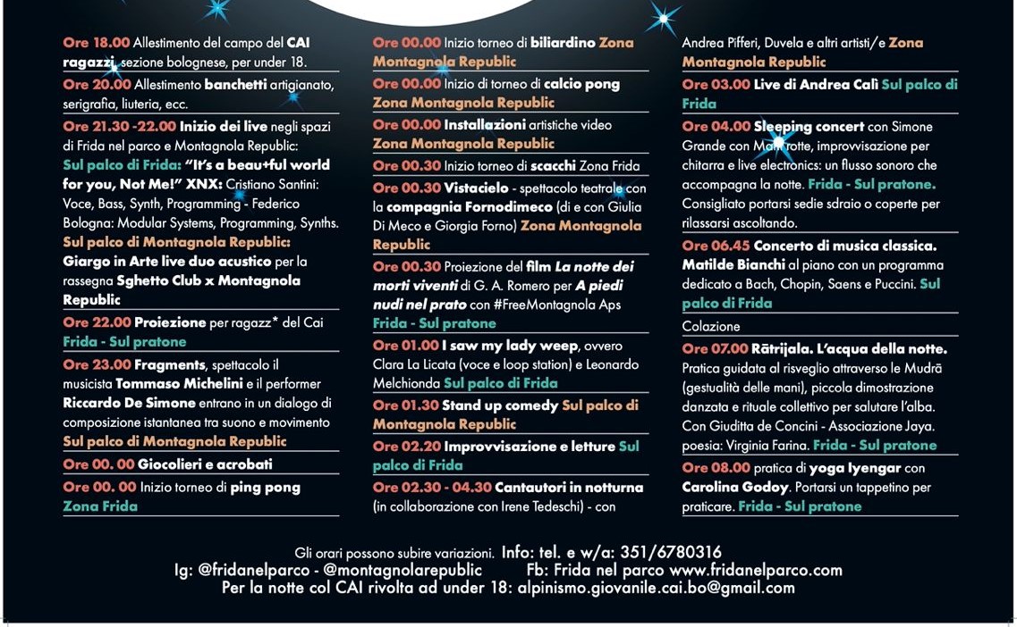 Sabato prossimo, 31 agosto, si terrà la "Notte bianca in Montagnola”, un evento organizzato da Frida nel Parco e Montagnola Republic, in collaborazione con il Comune, che animerà il Parco della Montagnola per tutta la notte.