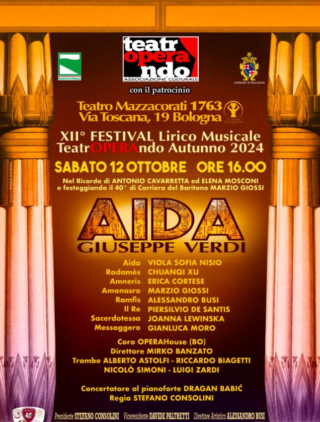 Sabato 12 ottobre alle ore 16.00, al Teatro Mazzacorati 1763, si terrà l'Aida si Giuseppe Verdi, nel ricordo di Antonio Cavarretta ed Elena Mosconi e festeggiando il 40° anno di carriera del baritono Marzio Giossi.